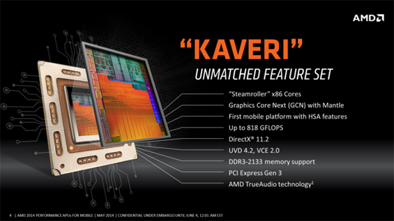 Показатель TDP у мобильных чипов AMD Kaveri варьируется от 17-19 ватт до 35 ватт, а в состав этих APU помимо прочего входит контроллер памяти с поддержкой DDR3 2133 и технология обработки звука TrueAudio.