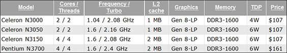Чипы Celeron N3150 и Pentium N3700 наделены 4 ядрами и 2 Мбайт кеша L2. Номинальная частота одинакова — 1,6 ГГц. Повышенная частота достигает соответственно 2,08 и 2,4 ГГц. Частота графического блока — до 640 и 700 МГц. Показатель TDP равен 6 Вт.