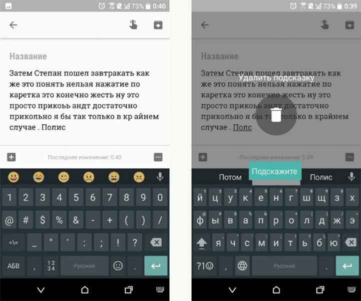 Теперь долгим нажатием по подсказке можно её быстро удалить. Кроме того, появился быстрый доступ к смайлам и numpad-клавиатуре.