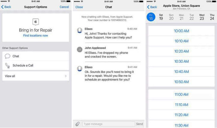 Приложение Apple Support обеспечит пользователей технической поддержкой. С помощью программы пользователь может договориться по телефону или с помощью встроенного чата с сотрудником AppleCare о посещении Genius Bar в фирменных магазинах Apple Store для сдачи устройства на ремонт или решения других проблем. Также прямо из приложения можно указать нужный магазин, дату и время посещения, чтобы к этому моменту вас уже ждал специалист из службы поддержки, сообщает 4pda.ru.