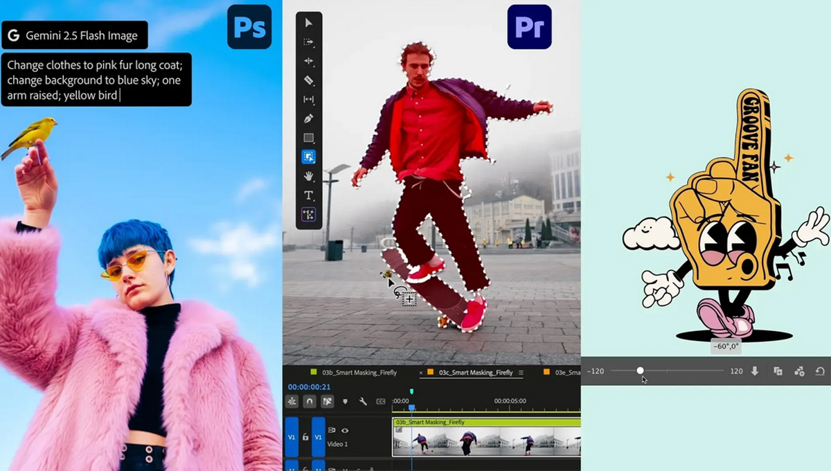 В Photoshop в инструменте Generative Fill теперь можно использовать, помимо Adobe Firefly, сторонние ИИ-модели, например, Gemini 2.5 Flash от Google и Flux.1 Kontext от компании Black Forest Labs. После выбора изображения и ввода текстового запроса, например, на добавление или замену объекта, редактор может переключаться между моделями для получения разнообразных результатов.