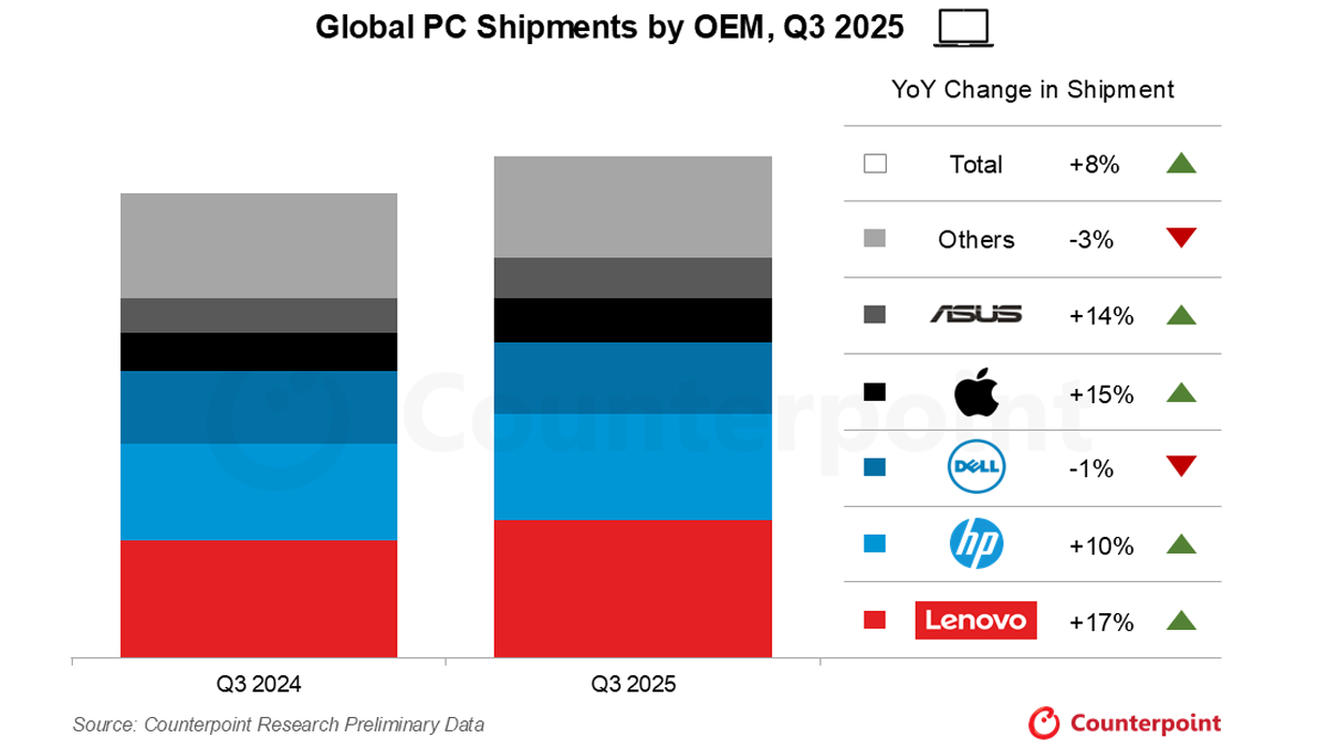 Согласно данным аналитической компании Counterpoint Research, продажи новых ПК выросли по всему миру. По итогам третьего квартала 2025 года общий рост поставок ПК составил 8,1% в годовом исчислении. После окончания 14 октября 2024 года официальной поддержки Windows 10 пользователи стали массово переходить на Mac, несмотря на усилия Microsoft по продвижению новых ИИ-ноутбуков с Copilot+. Компания Apple нарастила поставки Mac на 14,9% в годовом выражении.
