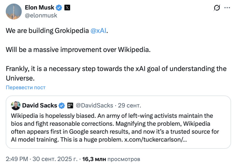 Mask, özünün “X” sosial şəbəkəsində Saksa cavab verərək bildirib ki, Wikipedia “ümidsiz dərəcədə qərəzlidir”. Bununla belə, o, Google axtarışında lider mövqedə qalır və süni intellekt üçün əsas bilik bazası kimi istifadə olunur. Maskın fikrincə, bu, ciddi risklər yaradır.