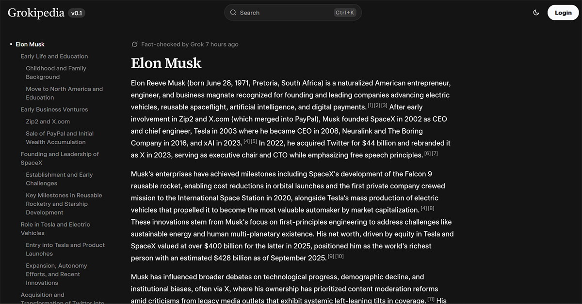 Сейчас Grokipedia доступна в бета-версии v0.1, но опробовать ее могут уже все желающие — бесплатно в веб-версии. На момент запуска в энциклопедии были зарегистрированы 885 279 статей. Для сравнения: в Wikipedia их более 7 млн. только на английском языке.