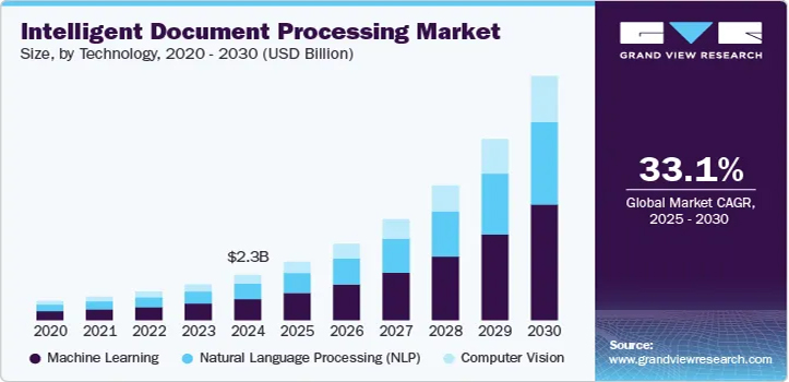 Прогрессивно мыслящие организации находятся в поиске технологий, которые оптимизируют операции, сокращают количество ошибок и повышают производительность. Одна из таких технологий — интеллектуальная обработка документов (Intelligent Document Processing — IDP), основанная на искусственном интеллекте. IDP позволяет организациям любого размера отказаться от дорогостоящих и неэффективных ручных процессов, повысить точность обработки данных и более эффективно использовать имеющихся сотрудников. Объем рынка IDP в 2024 году составил 2 млрд. долларов, а к концу 2037 года, согласно прогнозам, он достигнет 62 млрд. долларов, увеличиваясь в среднем на 30% в течение прогнозируемого периода. В 2025 году объем отрасли интеллектуальной обработки документов оценивается в 2,8 млрд. долларов. Это свидетельствует о том, что компании быстро внедряют технологии обработки документов, поскольку потребность в автоматизации сложных сценариев продолжает расти. Период экономической нестабильности еще больше повышает спрос на технологии обработки документов. Именно в это время государственные и частные организации стремятся повысить эффективность и сократить расходы, сокращая неэффективные ручные процессы.