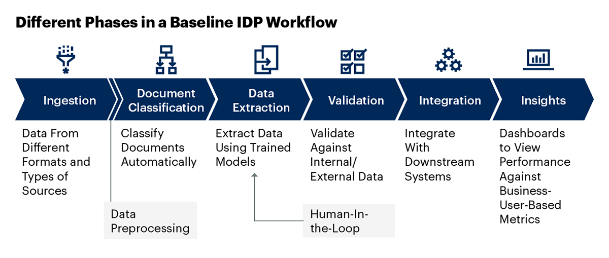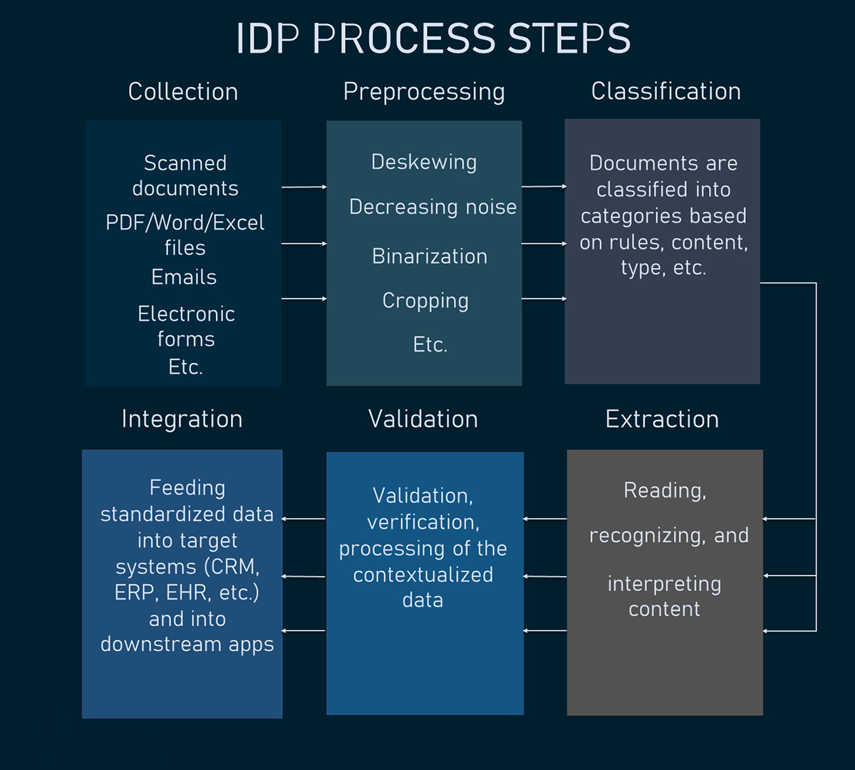 Процесс интеллектуальной обработки документов обычно следует за установленной серией шагов, которые позволяют компании автоматизировать свой документооборот: