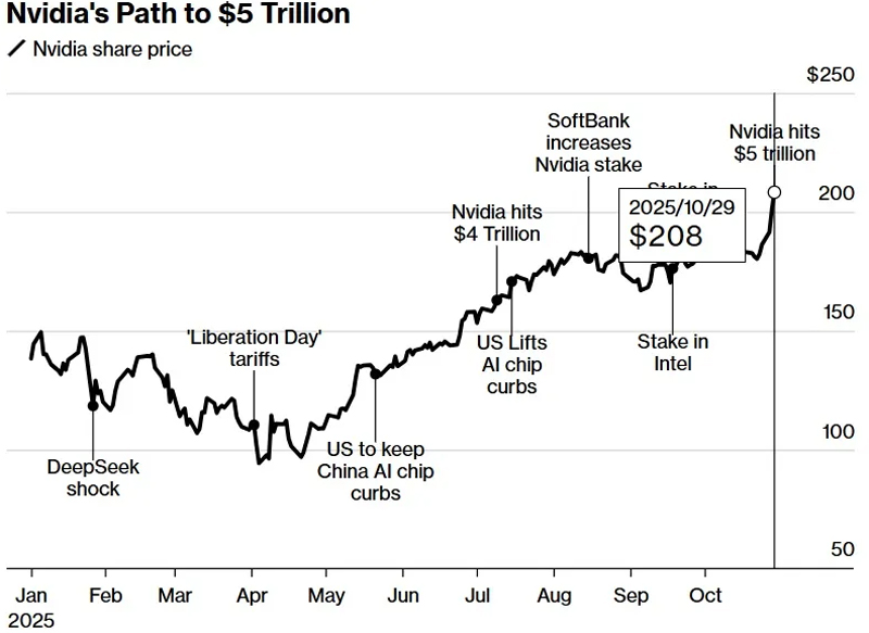 NVIDIA стала первой в мире компанией с рыночной капитализацией в 5 трлн. долларов. После открытия торгов 29 октября 2025 года акции NVIDIA выросли почти на 5%, до 211 долларов за штуку. Следующими по величине компаниями являются Microsoft и Apple, чья капитализация составляет около 4 трлн. долларов.