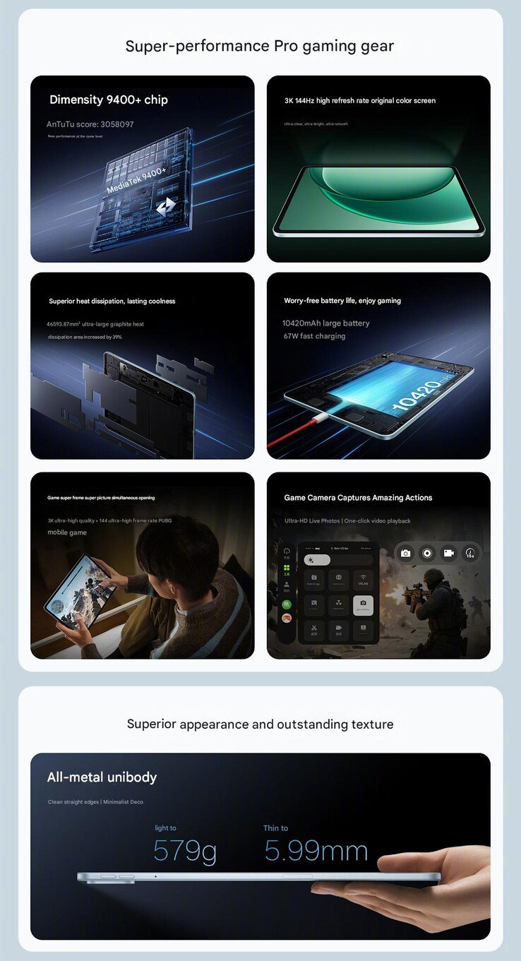 Планшет работает под управлением ColorOS 16 с рядом новых функций: Game Camera для записи 30-секундных роликов геймплея и скриншотов игр, учебные инструменты для улучшения рукописного ввода и извлечения записей из лекций, а также возможность одновременного запуска до пяти окон и оптимизация шрифтов под большой экран.