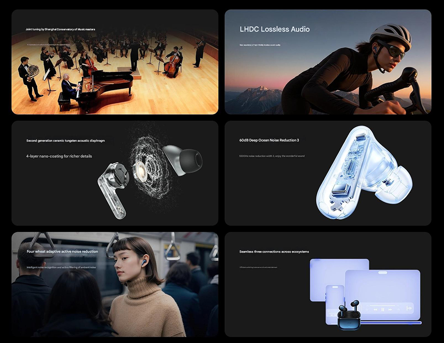 Гарнитура сертифицирована по стандарту Hi-Res audio и оборудована системой активного шумоподавления (ANC) с заявленной пиковой эффективностью до 60 дБ при среднем значении около 28 дБ. При разговорах по телефону также используется ИИ-шумоподавление. Еще одной особенностью стала поддержка технологии deepX 4.0, обеспечивающая объемное стереозвучание.