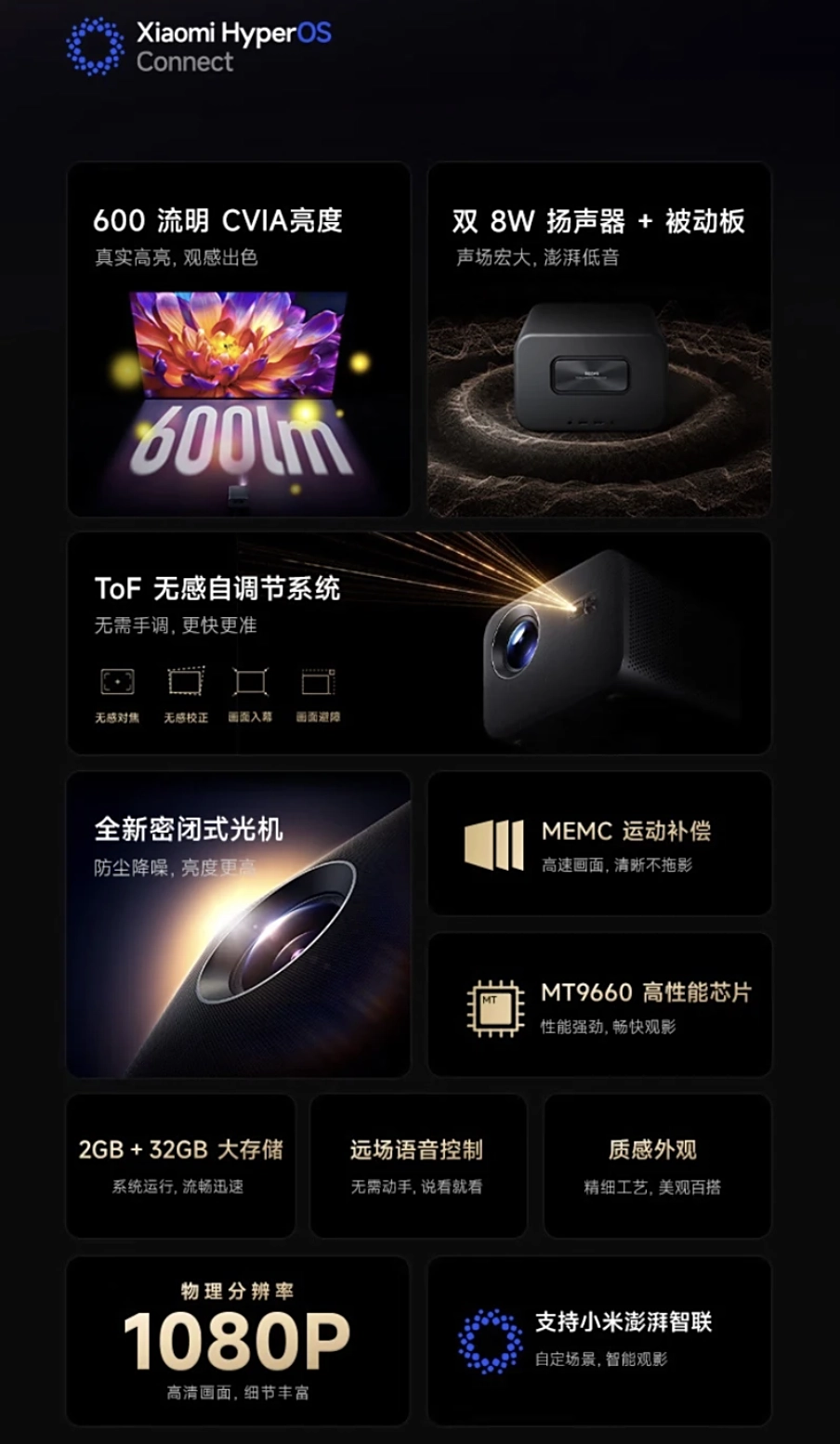 Yeni proyektor lazer işıq mənbəyi ilə təchiz olunub, 1920×1080 piksel (Full HD) qətnaməni dəstəkləyir və 600 CVIA-lümen parlaqlıq təmin edir. Proyeksiya nisbəti 1.25:1 təşkil edir. Cihaz həmçinin MEMC texnologiyasını dəstəkləyir ki, bu da hərəkətli səhnələrdə daha axıcı görüntü yaradır.