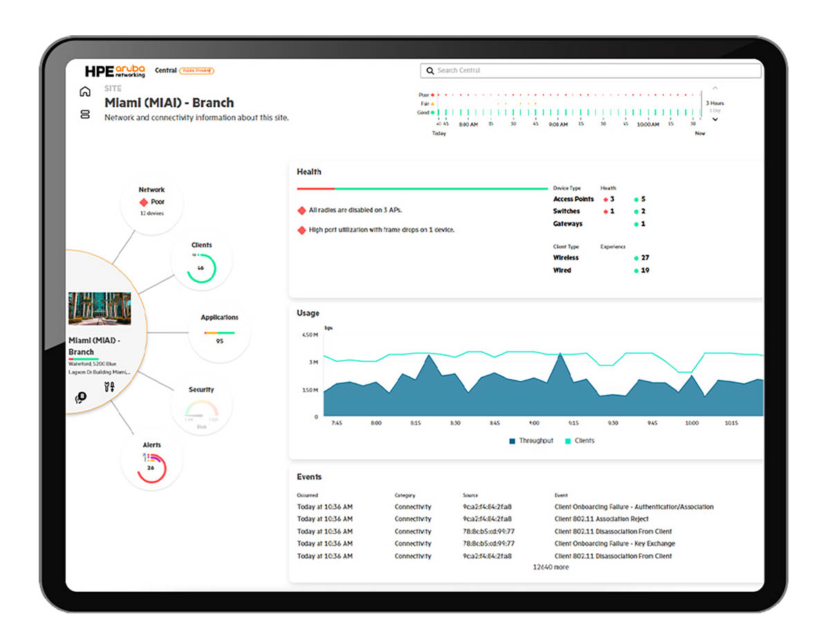 Ну и конечно, я не могу не упомянуть HPE Aruba Central — мощнейший инструмент для управления и мониторинга не только точками доступа, но и коммутаторами. Он создавался для удобства сетевого администратора с широкими возможностями для выявления неисправностей. Неисправности выявляются как реактивно, так и проактивно, в чем помогает искусственный интеллект. В HPE Aruba Central работает наша уникальная машина времени, которая позволяет вернуться на 7 дней назад до одной минуты и увидеть сеть в прошлом как в реальном времени. При чем вы можете видеть не только ваши сетевые устройства — коммутаторы и точки доступа, но и клиентов, подключенных в прошлом; приложения, которыми они пользовались; роуминг, который они совершали и многое другое.