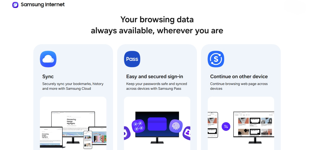 Браузер Samsung Internet for PC поддерживает синхронизацию Samsung Pass, закладок, истории и других данных между ПК и мобильными устройствами. Ранее пользователям обозревателя требовалось устанавливать специальное расширение для Chrome, чтобы синхронизировать закладки между ПК и мобильным устройством. При переходе с телефона на ПК можно продолжить просмотр с того же места, где вы остановились. Поддерживаются функции Galaxy AI — например, Browsing Assistant для быстрого реферирования и перевода веб-страниц.