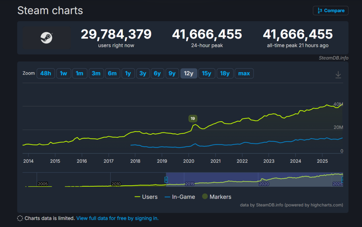 12 oktyabrda Steam-də eyni anda 41,6 milyon istifadəçi onlayn olub. Onlardan 13 milyondan bir qədər çoxu oyun oynayırdı, digərləri isə sadəcə sistemdə aktiv idi. Bu il ərzində platforma bir neçə dəfə öz rekordunu təzələyib — əvvəlcə 39,2 milyon, daha sonra 40 və 41 milyon göstəriciləri aşılmışdı.