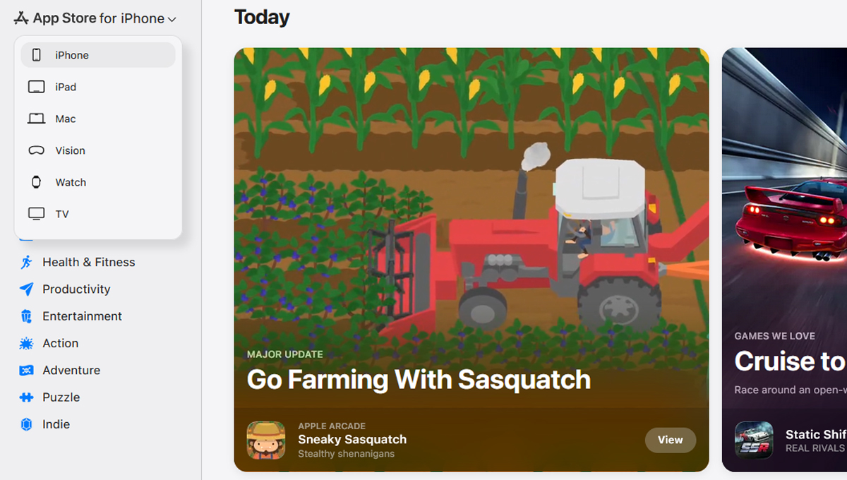 В веб-версии App Store появилась знакомая по iPhone вкладка Today с ежедневными подборками и рекомендациями, а также разделы с играми, приложениями и тайтлами Apple Arcade. Каждое приложение имеет собственную страницу с описанием, скриншотами, отзывами пользователей и другой информацией.