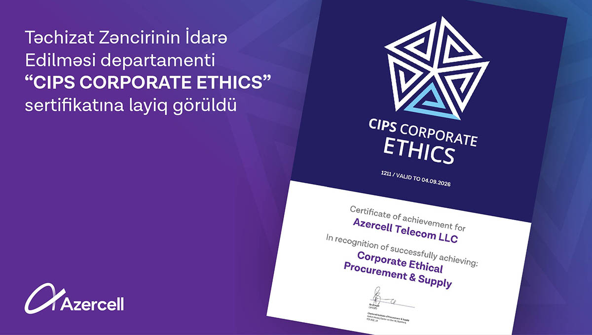 Сертификат CIPS отражает системный подход Azercell к этике закупок и управлению цепочкой поставок. Компания последовательно внедряет международные стандарты этики в процесс закупок, укрепляет устойчивую цепочку поставок и развивает корпоративную систему управления на основе принципов ESG, демонстрируя высокие стандарты деловой этики, прозрачности и доверия.