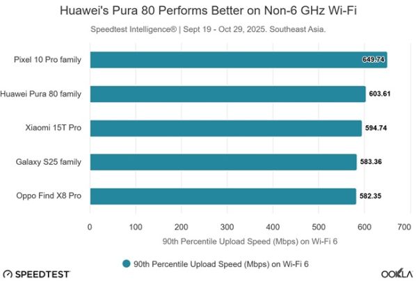 • HUAWEI Pura 80 6 GHz dəstəyinin olmaması səbəbindən inkişaf etmiş infrastruktur olan regionlarda daha aşağı pik sürətlər göstərir, amma Wi-Fi 6 rejimində göndərmə sürətlərində yenə də yüksək mövqedədir.