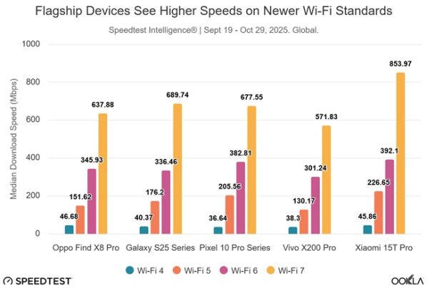 Apple-ın N1 çipi şirkətin ilk tamamilə öz Wi-Fi həlli sayılır: Wi-Fi 7, Bluetooth 6 və Thread bir çipdə birləşdirilib. Çip 160 MHz-lik kanalları dəstəkləyir, lakin bir çox Android flaqmanlarında olan 320 MHz dəstəyi yoxdur. Bununla belə, Ookla qeyd edir ki, real həyatda bu fərq demək olar ki, hiss olunmur. Çünki Wi-Fi 7 routerlərinin yayılması hələ məhduddur və 6 GHz tezliyi çox ölkələrdə tam açıq deyil.