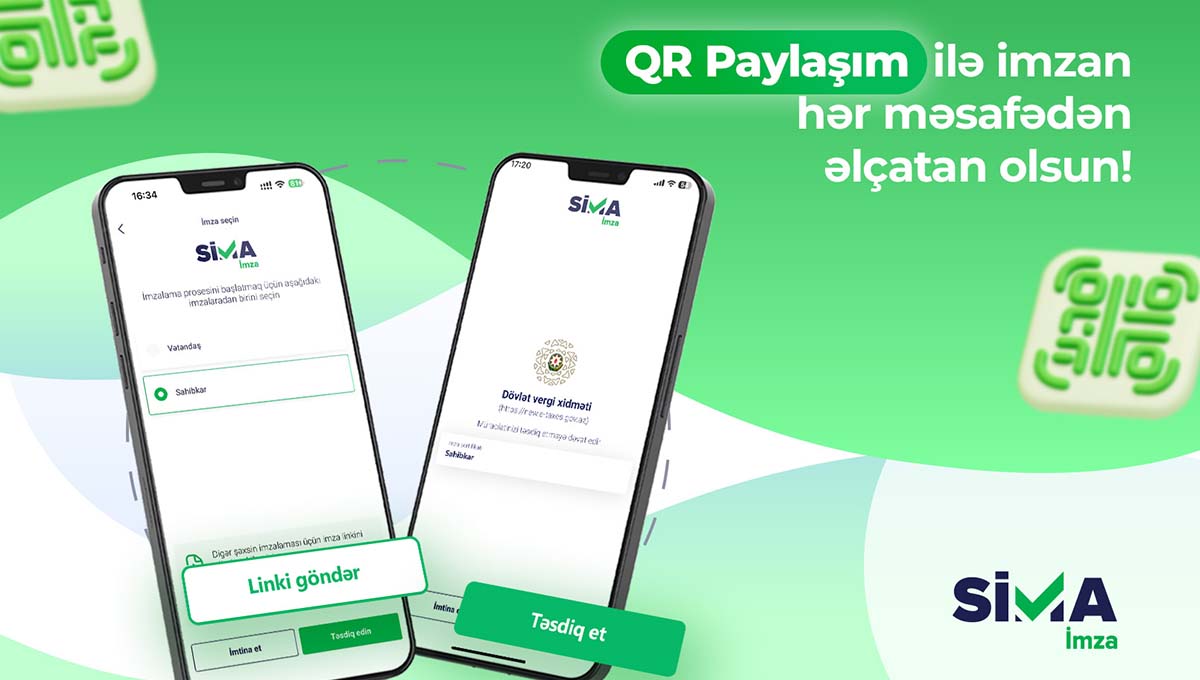 SİMA yeni nəsil rəqəmsal imzanın yeni QR paylaşım funksiyası istifadəyə verilib. Bu funksionallıq sayəsində artıq heç bir əlavə risk olmadan QR link vasitəsilə öz imza səlahiyyətini tək istifadəlik olaraq digər şəxsə (mühasib, məsul əməkdaş və digərləri) yönləndirmək mümkün olub.
