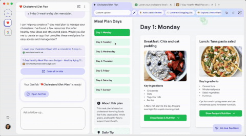Məsələn, GenTabs qidalanma planı və ya səyahət cədvəli hazırlamaqda kömək edə bilər — xəritə, maraqlı məkanlar, marşrut konstruktoru, mənbələrə keçidlər və açıq vərəqlərdən toplanan məlumatlarla dolu tam funksional mini-tətbiq quraraq.