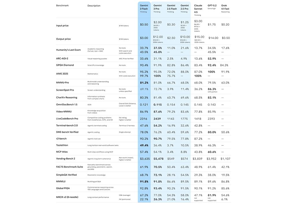 Gemini 3 Flash превосходит 2.5 Flash по всем параметрам и «значительно» превосходит мощную Gemini 2.5 Pro в нескольких тестах, включая MMMU Pro, Toolathlon и MPC Atlas. При этом она сохраняет высокую скорость работы и эффективность, свойственную Flash-версиям.