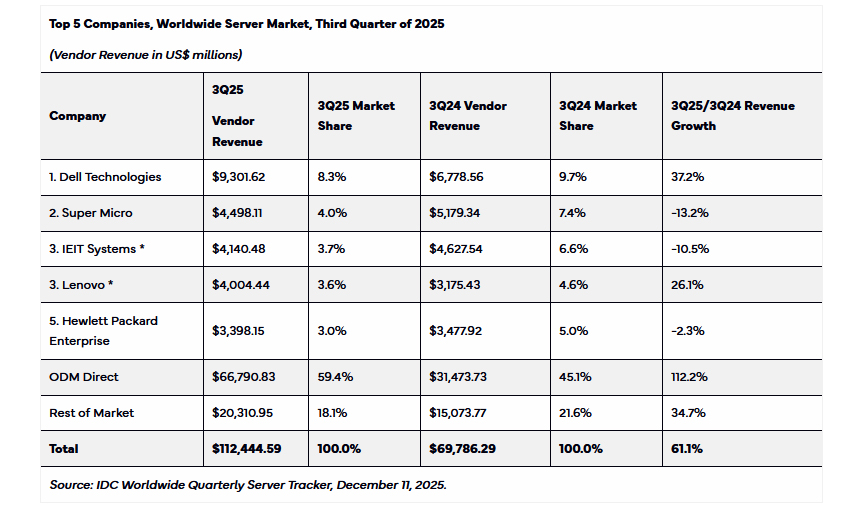 На первом месте в рейтинге ведущих поставщиков серверов находится Dell Technologies с выручкой в размере $9,3 млрд. и долей 8,3%. На втором месте — Supermicro с $4,5 млрд. и долей 4,0%, а замыкает тройку IEIT Systems с $4,14 млрд. и 3,7%. На четвертой и пятой позициях находятся Lenovo и НРЕ, выручка составила $4,0 млрд. и $3,4 млрд. соответственно, а рыночная доля — 3,6% и 3,0%.
