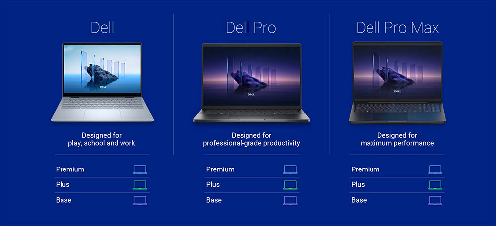 В начале 2025 года компания Dell Technologies объявила о совершенно новом брендинге линейки ноутбуков и рабочих станций. Производитель отказался от таких названий, как Inspiron, XPS, Latitude и Precision. Теперь названия ноутбуков и персональных компьютеров Dell напоминают принцип, выбранный компанией Apple для iPhone, с сериями, обозначенными просто как Dell, Dell Pro и Dell Pro Max. Кроме этого, в каждой версии существуют базовые модели, обозначенные как Plus и Premium, которые ранее были известны как Inspiron или XPS. Серия Dell Pro заменяет линейку бизнес-ноутбуков Latitude, а Dell Pro Max занимает место предыдущей линейки рабочих станций Precision.