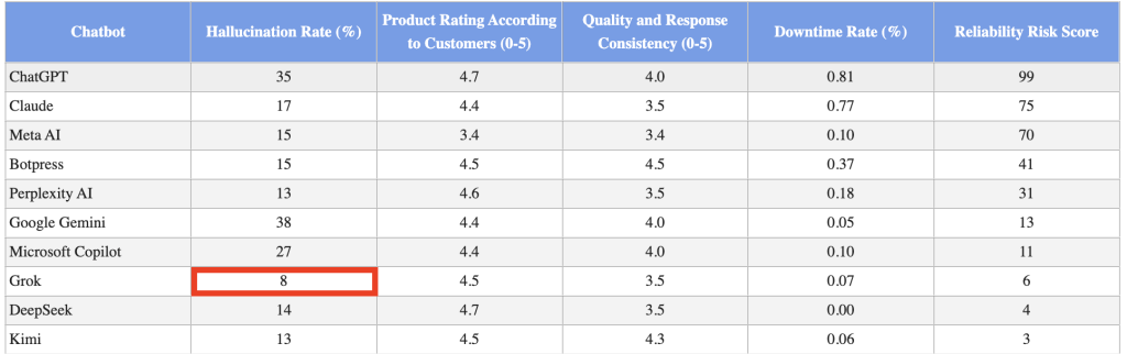 Остальные параметры Grok — рейтинг клиентов 4,5, стабильность 3,5 и время простоя 0,07%, что привело к общему показателю риска всего 6 баллов. DeepSeek занял второе место с 14% случаев возникновения галлюцинаций и нулевым временем простоя, получив показатель риска 4. Высокие показатели галлюцинаций и времени простоя ChatGPT обеспечили ему наивысший балл показатель риска 99.