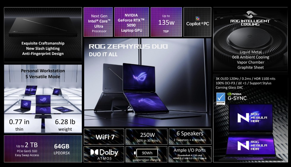 Компания Asus представила на выставке CES 2026 ряд новинок: одной из наиболее заметных стал обновленный игровой ноутбук ROG Zephyrus Duo (GX651), выполненный в алюминиевом корпусе. В отличии от предшественника, модель 2026 года получила сразу два полноценных 16-дюймовых экрана. Помимо этого, ноутбук предлагает производительную начинку.