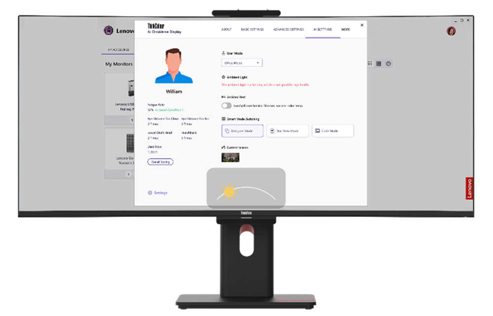 Еще одна представленная сегодня концепция интеллектуального дисплея — AI-Powered Personalized Display — позволяет адаптировать визуальные решения Lenovo к потребностям различных пользователей в режиме реального времени. Данный прототип разработан как дисплей для нескольких пользователей. С помощью встроенного ИИ такой монитор автоматически подстраивает настройки экрана в зависимости от профиля пользователя, находящегося за экраном, с учетом времени суток и его географической локации для автоадаптации циркадных ритмов, яркости дисплея, цветовой температуры и мониторинга показателей здоровья (осанки, усталости глаз и т.д.) в режиме реального времени.