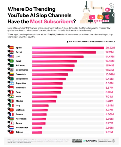 Kapwing onlayn video redaktorunun araşdırmasına əsasən, YouTube-a yeni daxil olan istifadəçilərə tövsiyə edilən videoların 20%-dən çoxu süni intellektlə hazırlanmış kontentdir. Analitiklər tamamilə İİ videolarından ibarət 278 kanal müəyyən ediblər — bu kanallar ümumilikdə 63 milyarddan çox baxış toplayıb və 221 milyondan artıq abunəçi qazanıb.