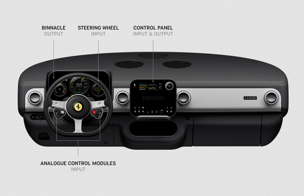 Итальянская компания Ferrari показала интерьер нового автомобиля Luce. Это первый полностью электрический автомобиль компании. Интерьер Luce довольно сильно контрастирует с тем, что можно было видеть в салонах других машин Ferrari. За его дизайн отвечает студия LoveFrom, созданная ушедшим из Apple главным дизайнером Джони Айвом.
