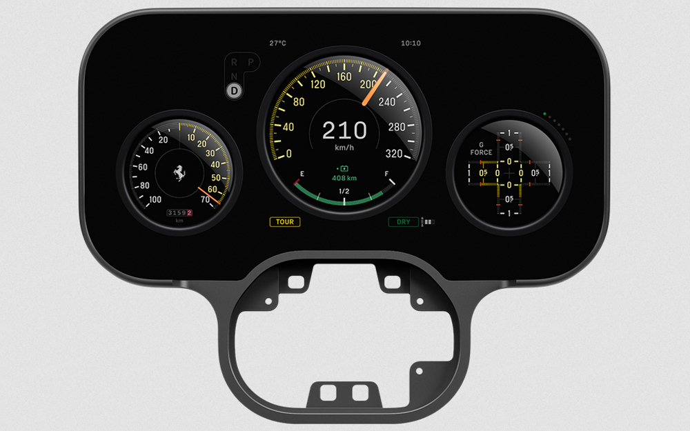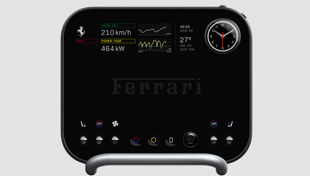 На электронном ключе размещен крупный цветной экран E Ink с логотипом Ferrari на желтом фоне. Когда ключ вставляется в гнездо на консоли, экран тускнеет.