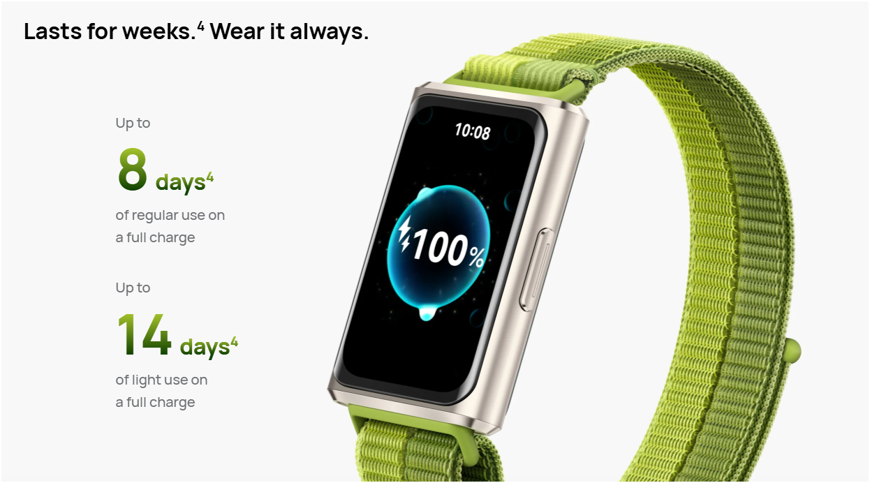300 mAh batareya sayəsində qurğular orta istifadə rejimində 14 günə qədər, standart istifadədə təxminən 8 gün, Always-On Display aktiv olduqda isə 3 gün işləyə bilir.
