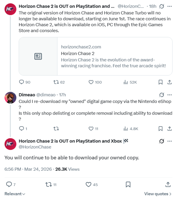 Bundan əlavə, Horizon Chase və Horizon Chase Turbo oyunlarının da taleyi sual altındadır. Onlar 1 iyundan etibarən rəqəmsal mağazalardan tamamilə silinə bilər. Hər iki layihə Aquiris Game Studio tərəfindən hazırlanıb və 2023-cü ildə Epic Games tərəfindən satın alınıb.