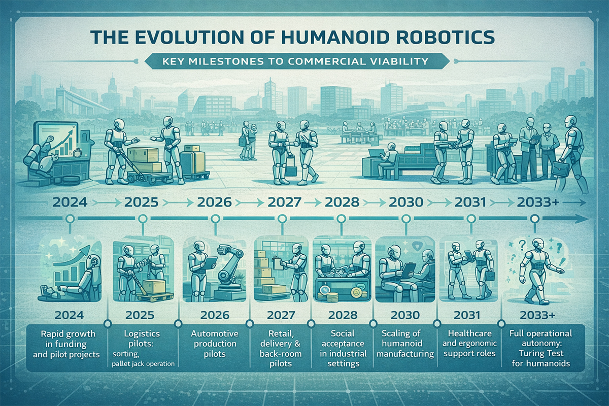 • 2028-2032: Первые коммерческие внедрения в логистике, складском хозяйстве и специализированных сервисных областях.