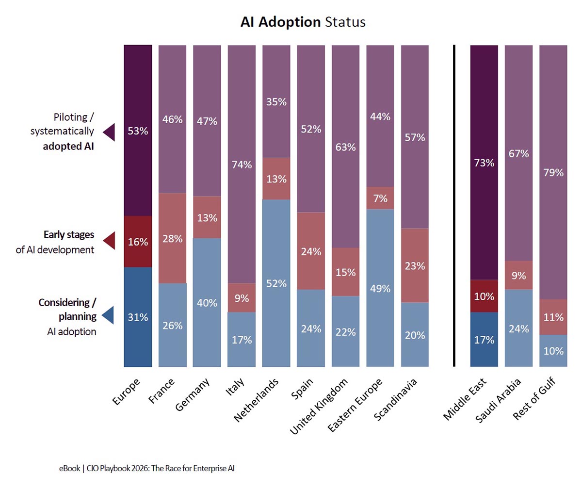 Более развитые рынки, такие как Скандинавия, Италия и Великобритания, уже переходят за рамки пилотных проектов: большинство организаций там системно внедряют ИИ и усиливают внимание к гибридным и edge‑моделям развертывания для поддержки масштабирования. Внедрение ИИ в странах Южной и Восточной Европы пока остается на более ранних стадиях, значительная доля организаций там находится на стадии планирования или ранней разработки. Ближний Восток формируется как быстрорастущий рынок, демонстрируя высокую динамику внедрения и резкий рост интереса (год‑к‑году) к продвинутым и агентным ИИ‑технологиям.