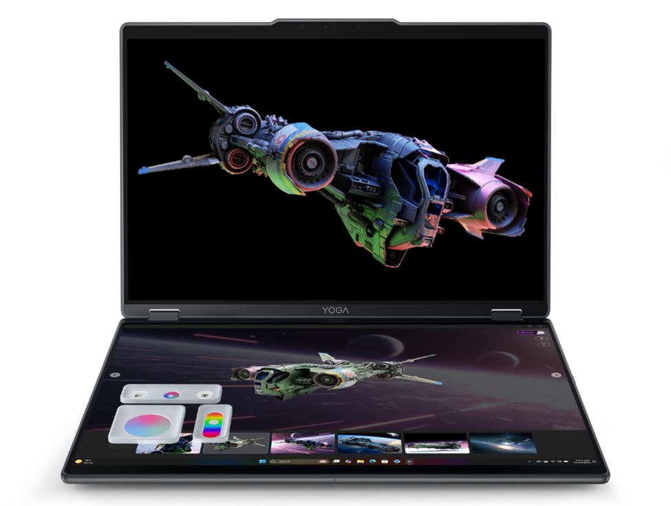 Yoga Book Pro 3D работает на процессоре Intel Core Ultra 7 в сочетании с графическим процессором NVIDIA GeForce RTX 5070, которые формируют конфигурацию, способную поддерживать ресурсоемкие задачи 3D-моделирования и рендеринга.