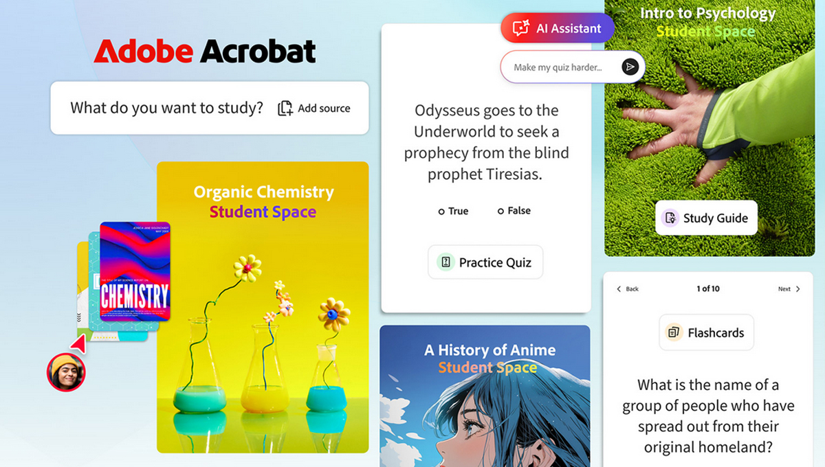 В последнее время Adobe Acrobat в основном ориентирован на профессионалов благодаря своим новым функциям на основе искусственного интеллекта. Теперь компания Adobe представила Acrobat Student Spaces, инструмент на базе ИИ, ориентированный на студентов. Он позволит создавать презентации, генерирует учебные пособия, подкасты и другие визуальные и звуковые материалы учебного назначения.