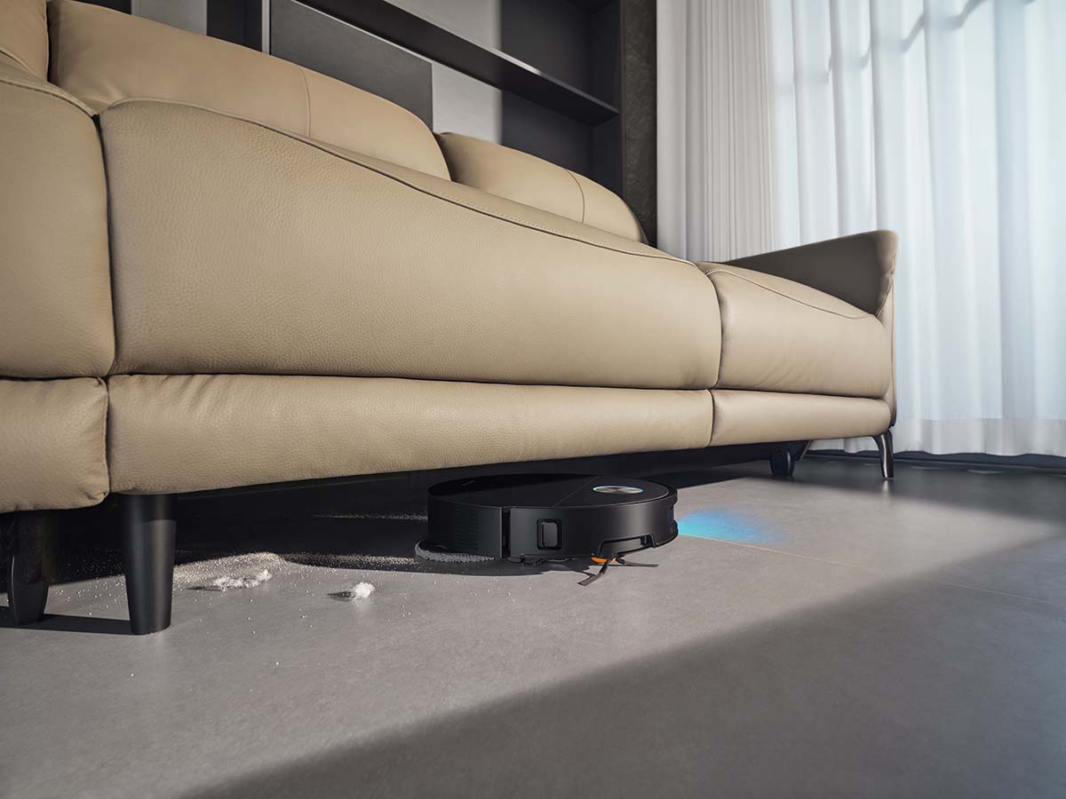 X60 Ultra Complete рассчитан на уборку в пространствах со сложной планировкой, низкой мебелью и порогами между помещениями. Ультратонкий корпус высотой 7,95 см в сочетании с выдвижным лидаром позволяет роботу убирать под диванами, кроватями и другой низкой мебелью.