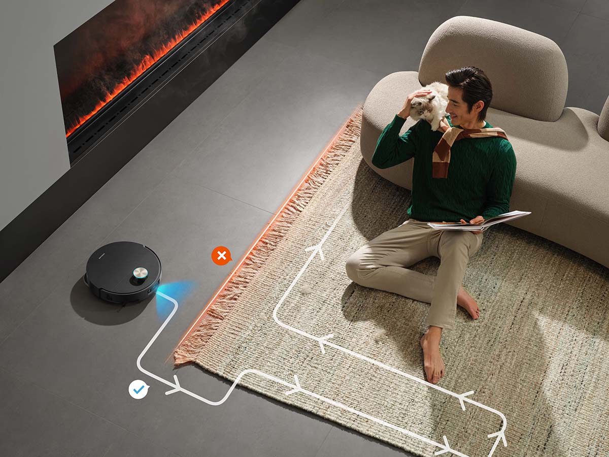 Дополняет систему технология проактивного обнаружения загрязнений: инфракрасная подсветка помогает точнее различать типы загрязнений даже на сложных поверхностях — темных, бликующих или с выраженным рисунком. Робот распознает не только тёмные пятна, но и светлые жидкие загрязнения, а также волосы и мелкие частицы, автоматически подбирая сценарий уборки и переключаясь между сухой и влажной очисткой в зависимости от ситуации.